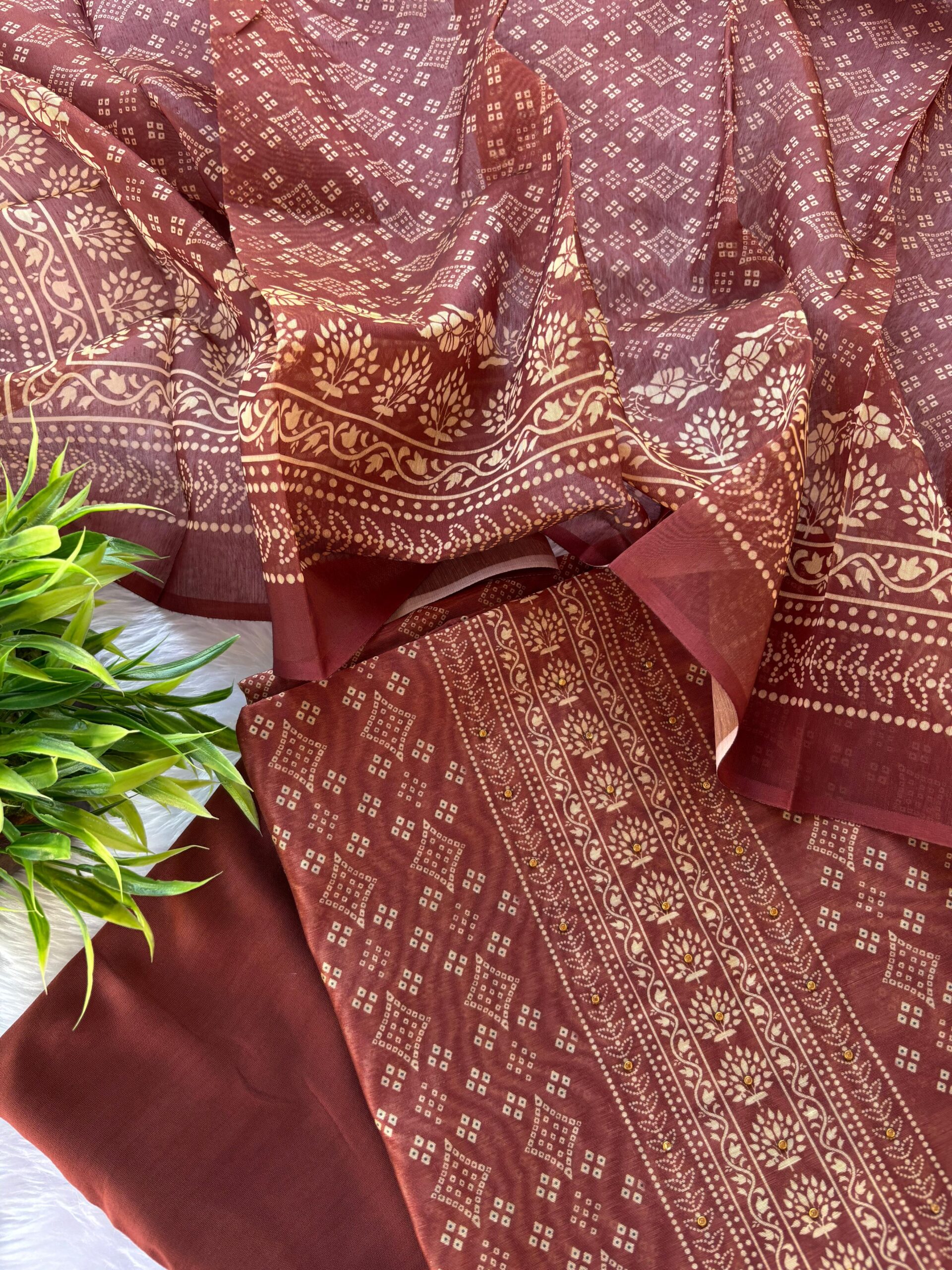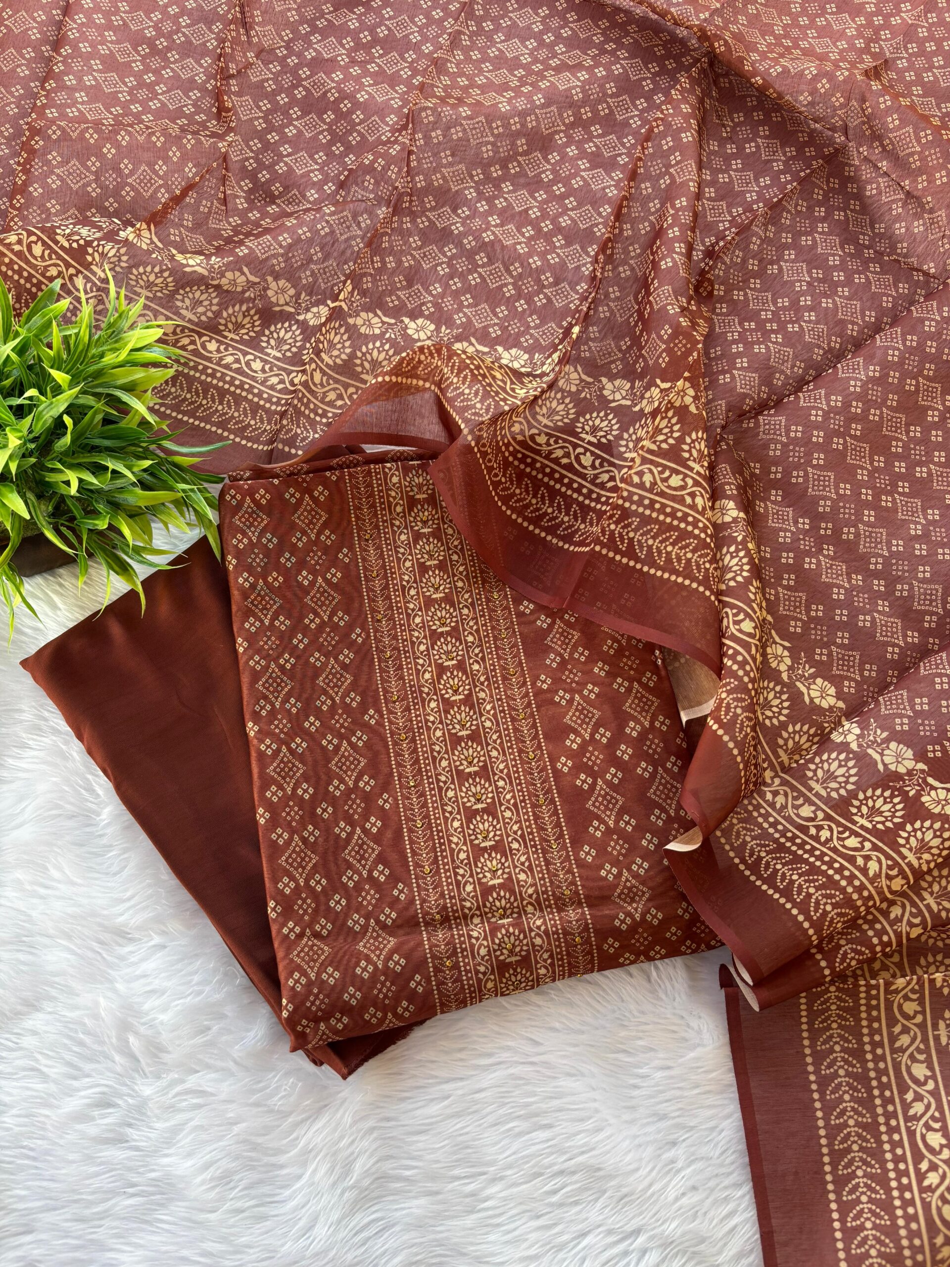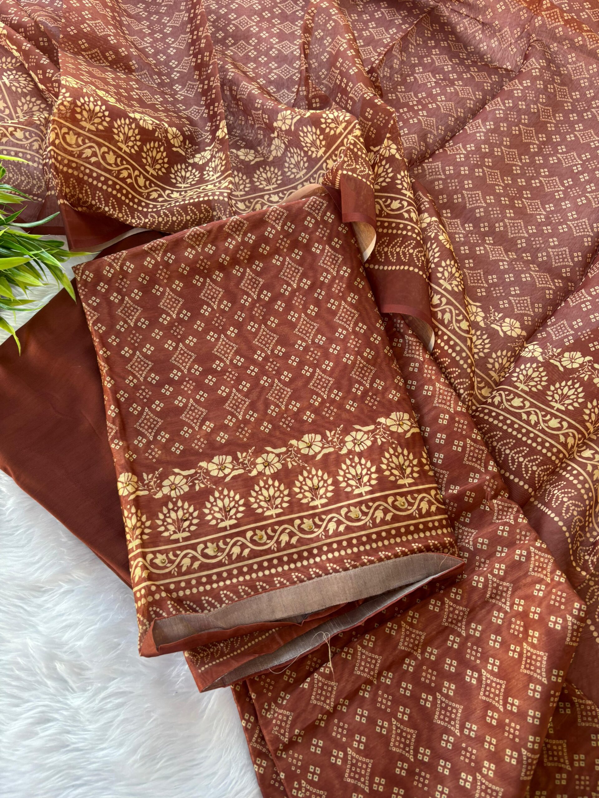 Rustic Brown with a batik design pure crepe silk cotton top 🍂❤️ paired with Premium rayon bottom ❤️🍂 and Shimmer shiny dupatta