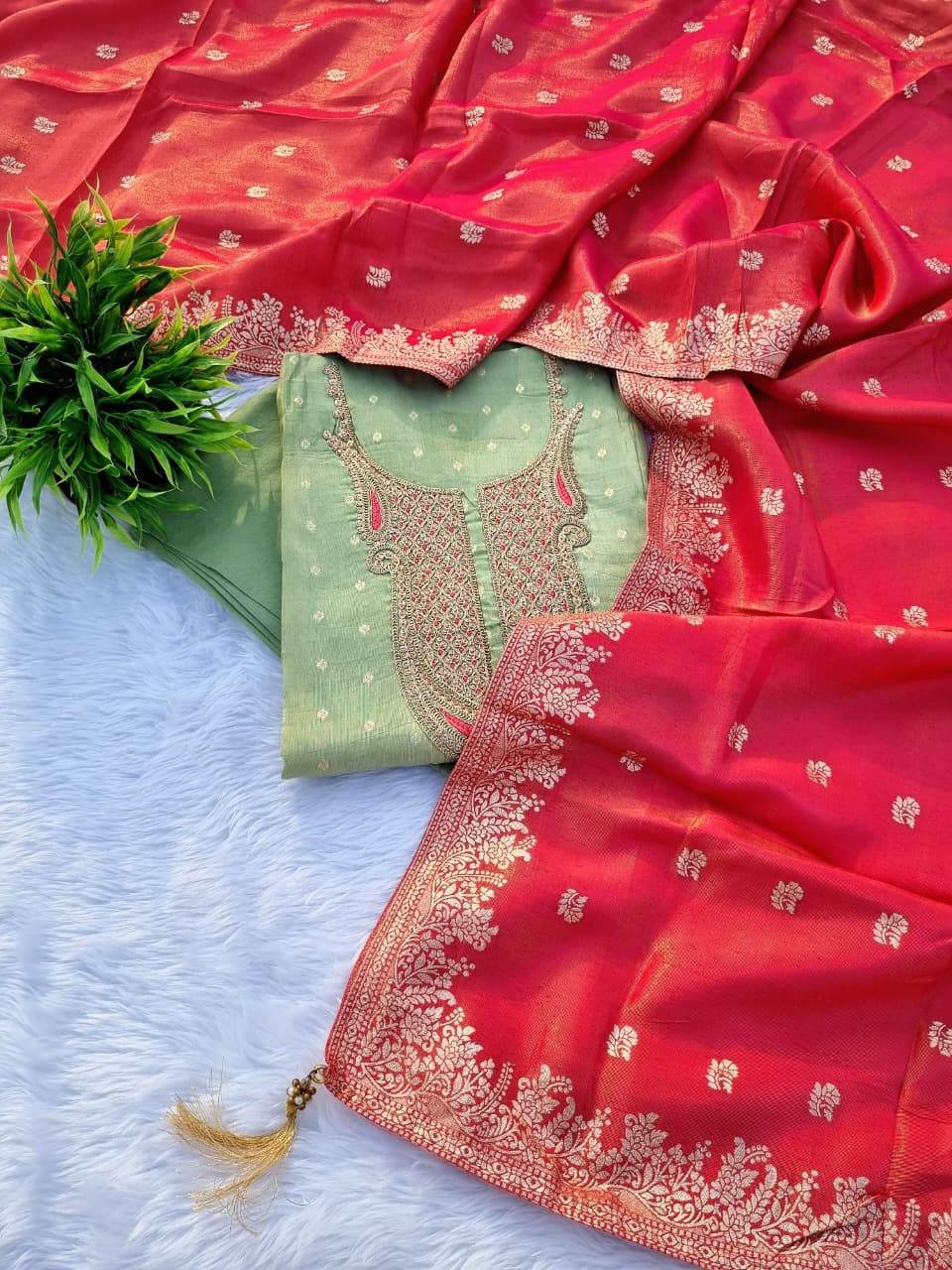 ✨ *Pure Tissue Shimmer Silk Embroidery work with daman lace work top* 🌸🌹 paired with *Pure Rayon Silk Bottom* 🪷🌸 and *Soft Pure Tissue Silk banarasi style dupatta with ladkan* 🌸🌷
